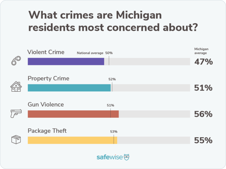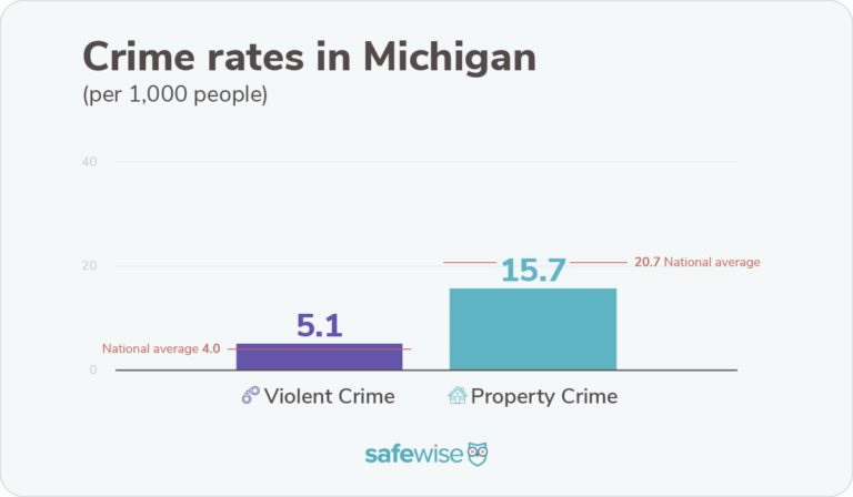Of the Michiganians we surveyed, 41% are worried about their safety on a regular basis. There may be good reason. Michigan ranked ninth in states with the highest violent crime rates. Overall, violent crime rose slightly year over year—from 5.0 instances per 1,000 residents to 5.1 . Property crime also increased from 13.8 to 15.7 incidents per 1,000 residents—but that puts Michigan as the tenth lowest state for property crime.