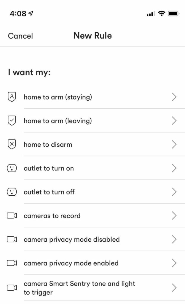 Rules can often be accessed and edited from multiple screens on the app. The easiest way to access all rules is to tap the three-bar icon in the upper-left corner of the security screen. Then, tap Custom Actions.