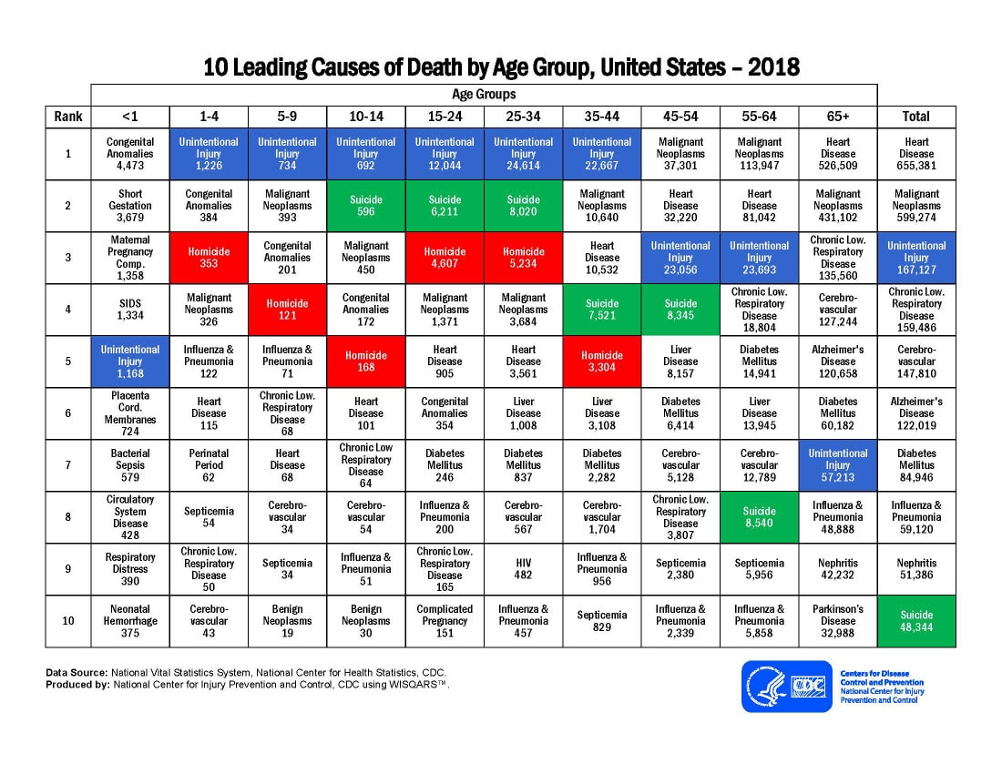 - Centers for Disease Control and Prevention, “10 Leading Causes of Death by Age Group, United States - 2018.” Accessed January 18, 2022.