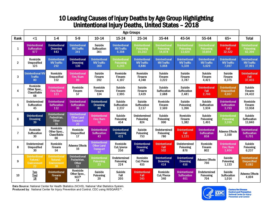 - Centers for Disease Control and Prevention, “10 Leading Causes of Injury Deaths by Age Group Highlighting Unintentional Injury Deaths, United States - 2018.” Accessed January 18, 2022.